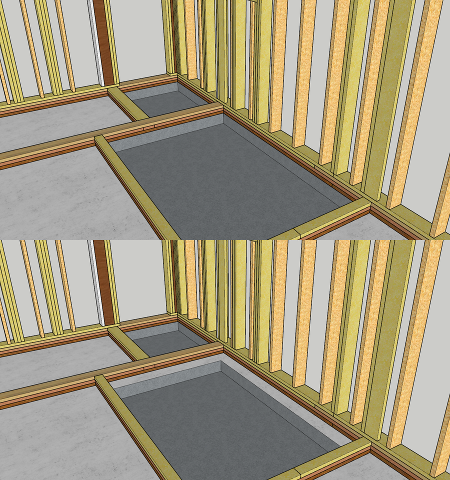 그림의 윗부분은 토대와 밑깔도리에서 화장실 단차를 바로 내린 경우입니다.