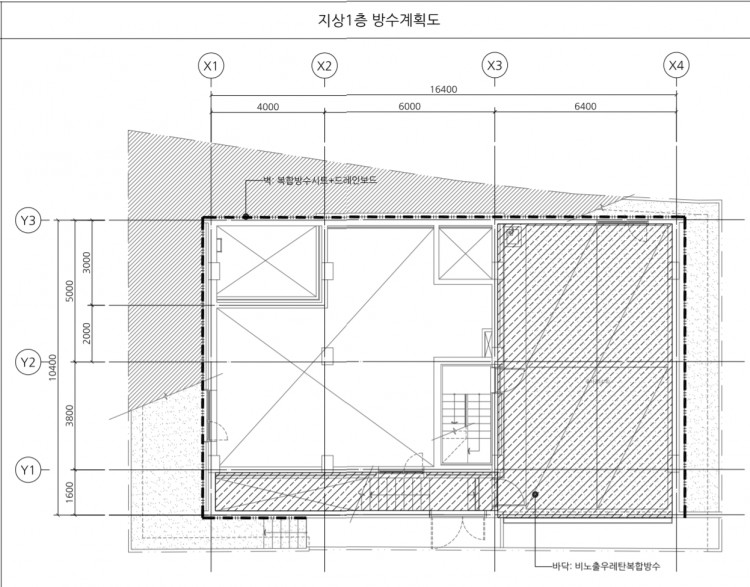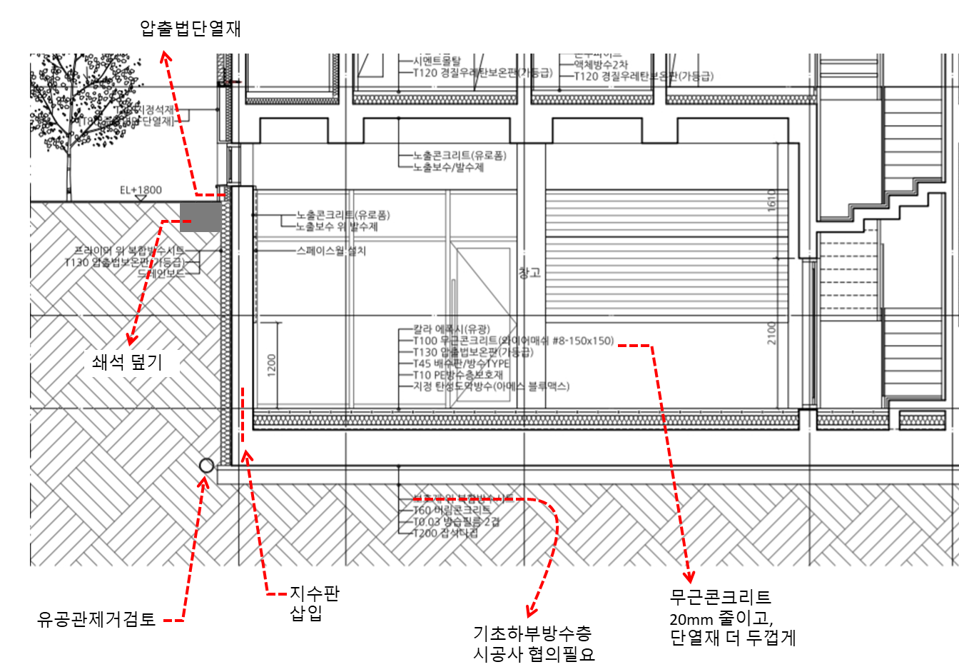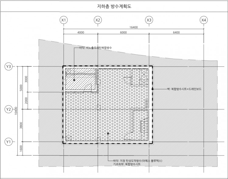 기초 콘크리트 하부에 방수층을 형성해서 외벽까지 타고 올라가도록 도면을 그리셨는데, 이 기초 하부 방수는 꽤 어렵습니다. 우리나라에서 실현가능할 것인지도 사실 잘 모르겠습니다.