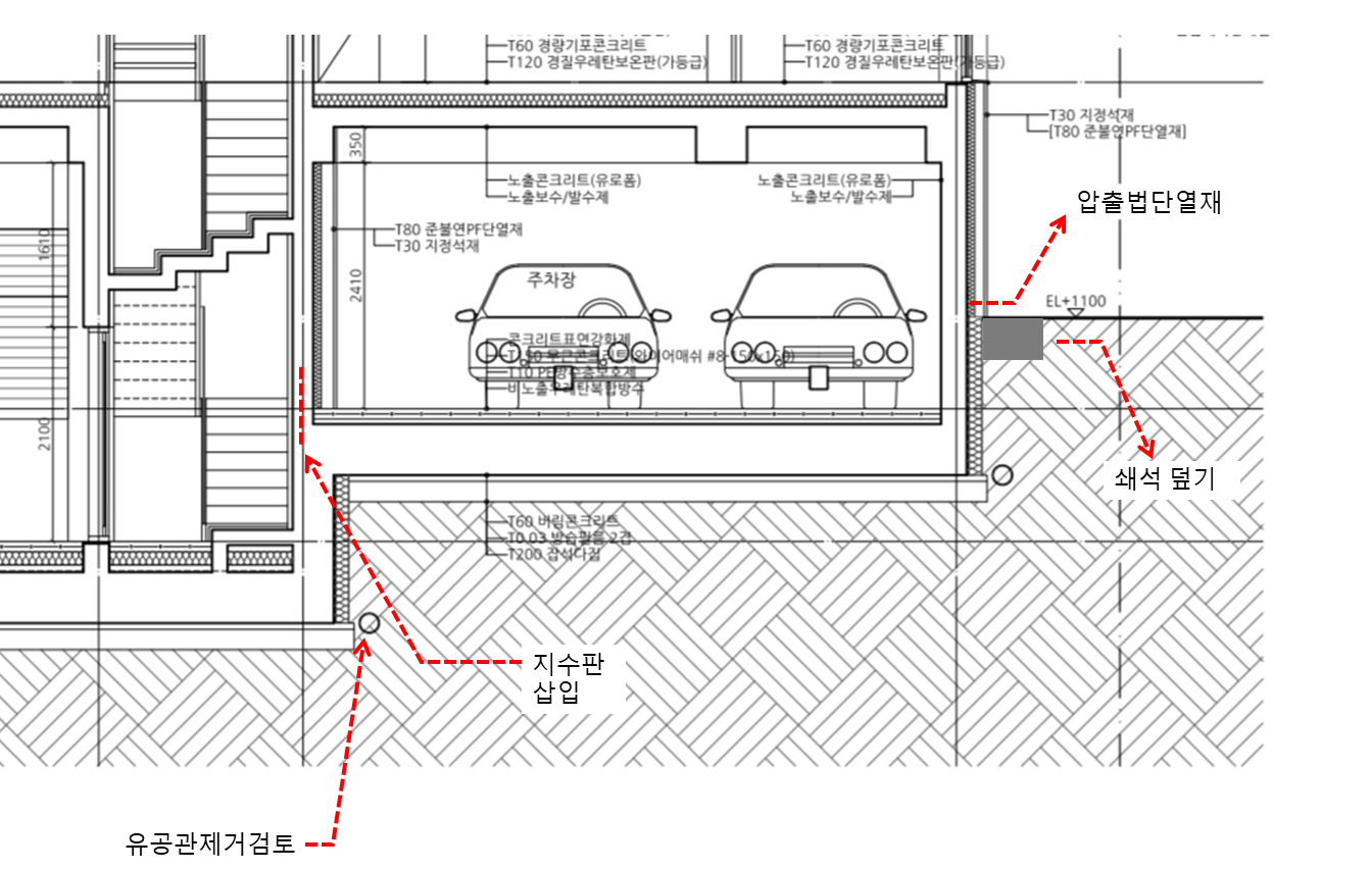 나머지 표시가 되지 않은 부분도 있는데, 유사한 부분 (지하에 있는 모든 이어치기된 부분 - 기초와 외벽이 만나는 곳)은 지수판이 있어야 합니다.