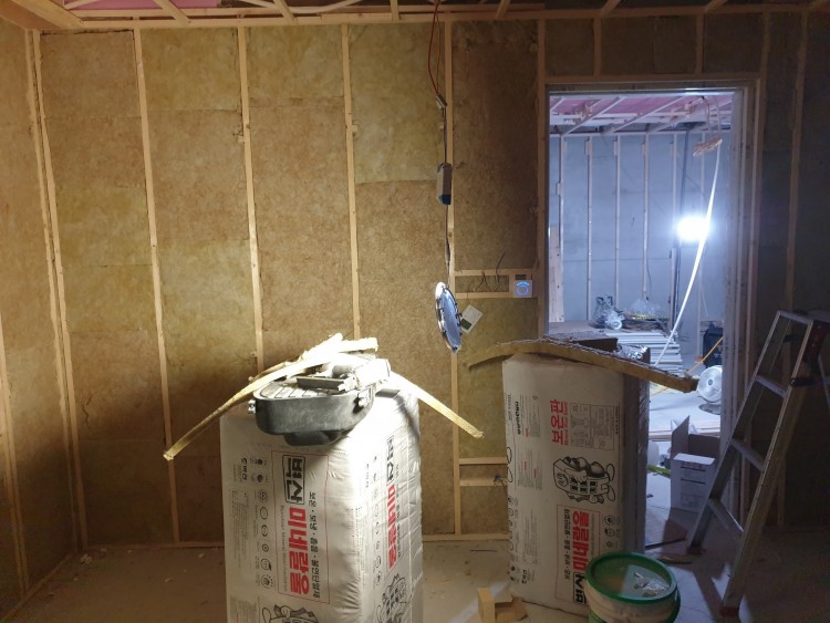 (2) 단열재를 띠장 간격에 맞추어 정확히 재단하고, 띠장 사이에 꼭 끼도록 설치하되 띠장의 춤은 수장재를 붙였을 때 단열재가 눌리지 않을 정도가 되도록 한다.