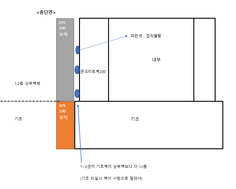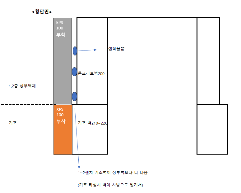 그래서 시공사는 그 단차를 깍지않고, 기초면까지는 XPS100을 화스너로 밀착하고 상부는 단열재 EPS 부착시 접착몰탈을 두껍게 발라 이 간격을 커버한 것입니다.