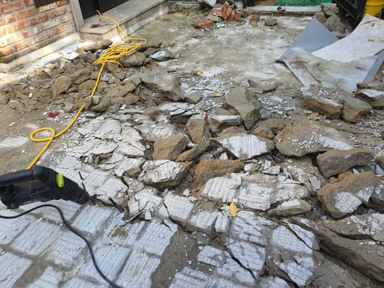 1번 사진은 2층세대의 앞마당이고 앞마당의 바로 밑은 1층세대의 빙입니다. 오늘 타일철거를 하다보니 구배가 잡혀있던 레미탈층이 바닥콘크리트면과 바로 분리되어 얕은곳은 10센티부터 23센티까지 철거를 진행하였습니다.