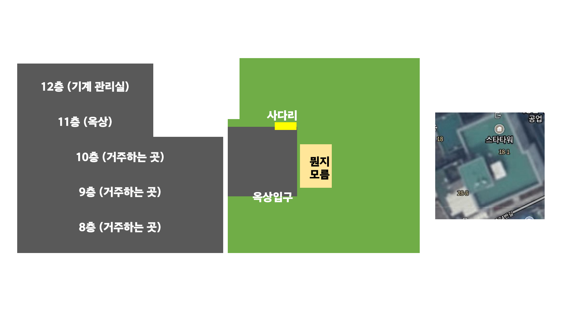 그런데 옥상에서 사다리타고 올라갈 수 있는 건물같은게 눈에 보입니다. 우선 소리의 경우에는 화장실 쪽의 환풍구 쪽에서 울리는 상황입니다. 지금 현재 들어보니 뭔가 회전하는 소리와 비슷한 것 같기도 하구요. 그래서 벤츄레이터가 유력해보이긴 한데 건물 옥상 쪽에는 이게 보이지 않네요.