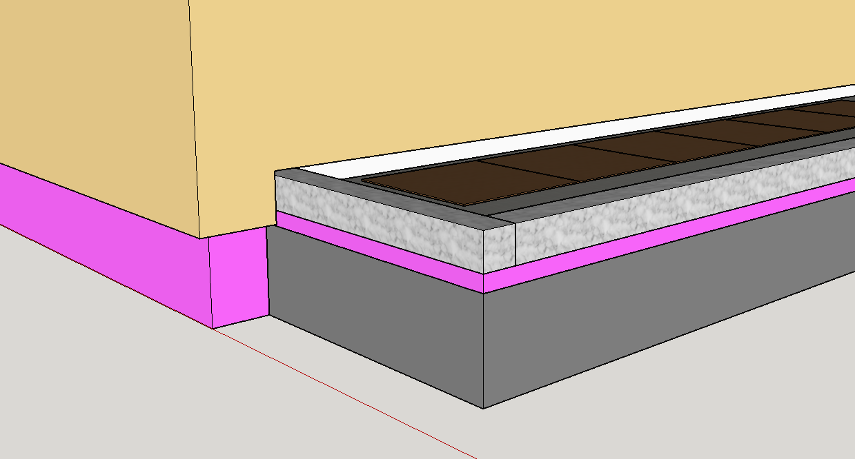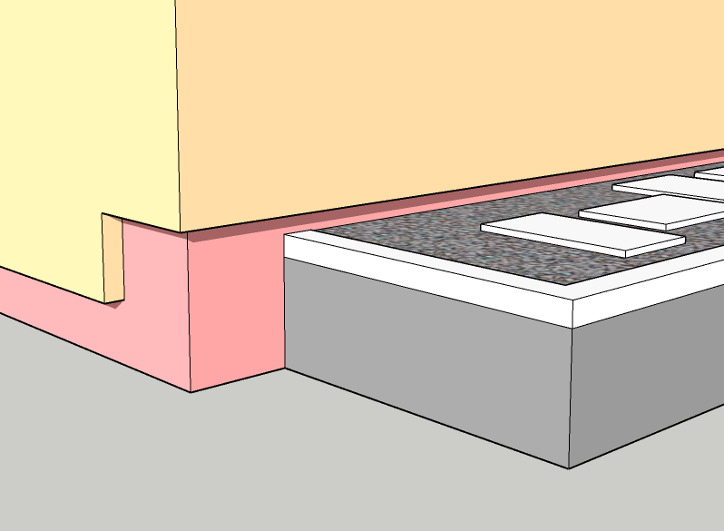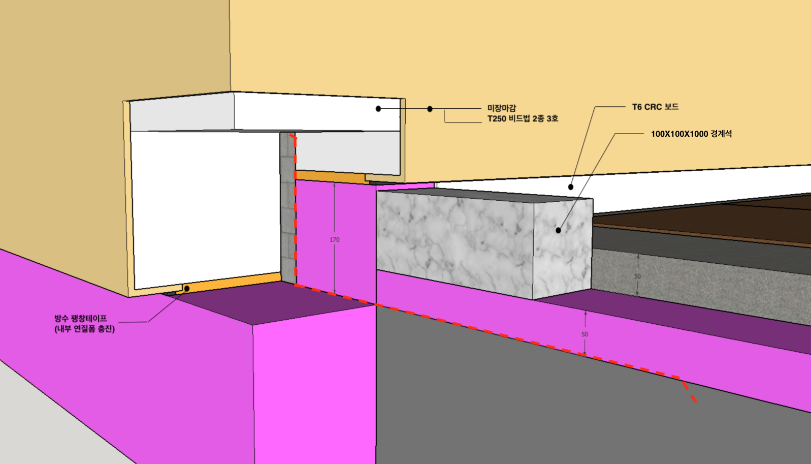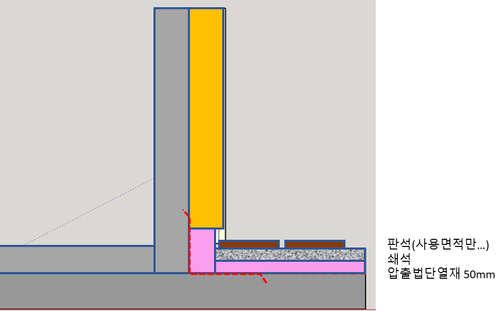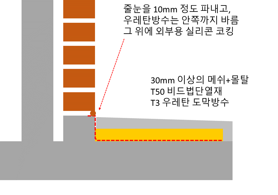 일단 단열재가 깔리고 배수 및 마감층이 올라오도록 외벽 쪽에 방수층 높이를 확보하는 게 문제인 것 같습니다.
