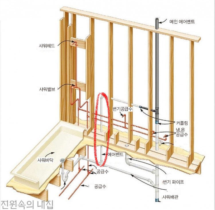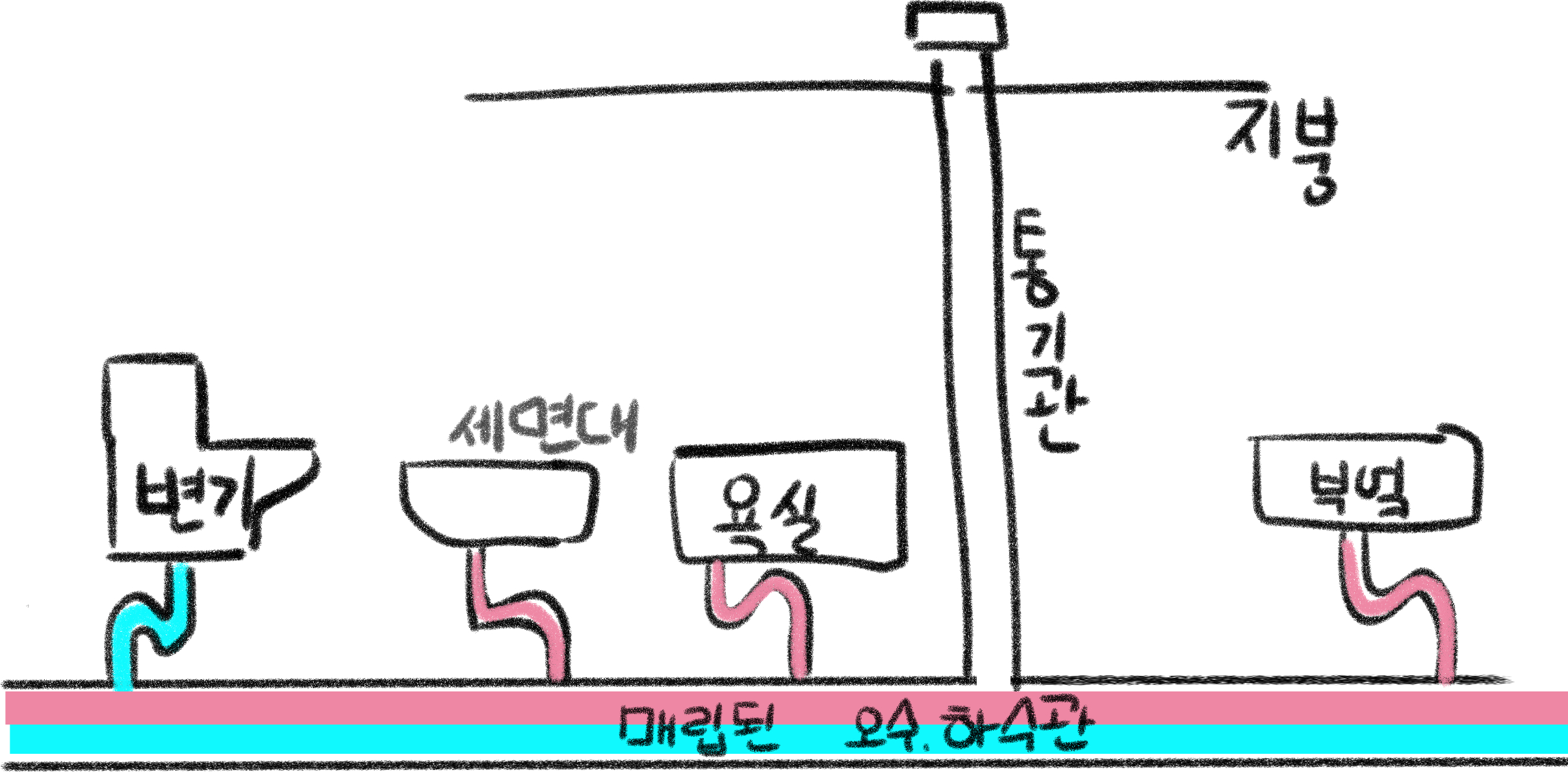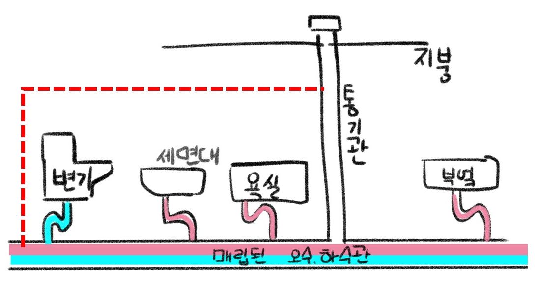오수와 다르게 하수의 경우 세탁기와 욕조 정도만 통기관과 연결해도 단층에서는 문제되지 않습니다.