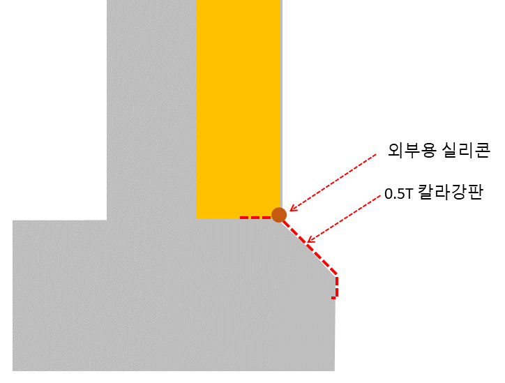 그냥 잘라 내기만 하면 안되고요. 아래 그림처럼 사선으로 잘라낸 다음.. 면을 정리할 비용으로 칼라강판을 그림처럼 삽입해서 마감이 되면 좋겠습니다.
