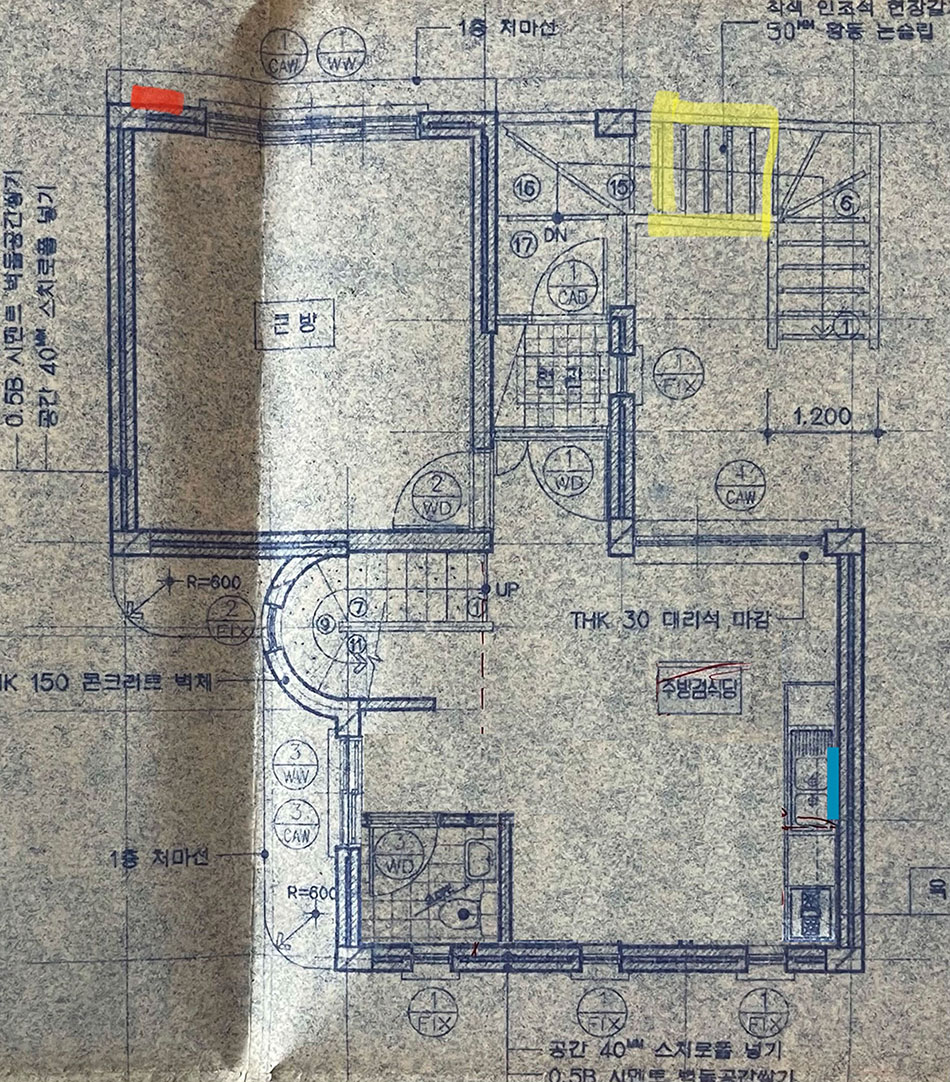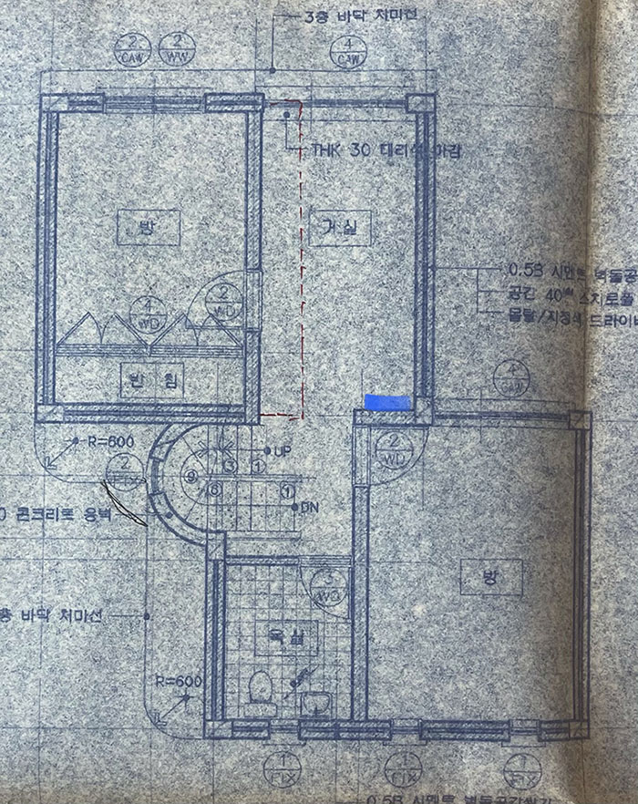저도 2,3층 슬라브를 관통해서 올라갔으면 했는데요.. 도면을 아무리 바라봐도 그 위치가 적당치 않네요. ㅠㅠ
