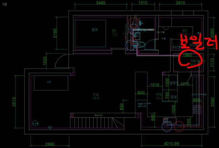 도면에서 보시다시피 방2로 들어가는 난방배관은 화장실로 가는 수도배관과 겹칠수 밖에 없자나요..