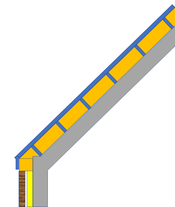 그리고 처마 상단에 발생하게 될 열교(노란색 화살표)를 막기 위해 글라스울과 EPS을 겹쳐서 배치할 건데요. 다만 투습방수지를 부착하는 처마 측면과 단열재가 겹쳐지는 두께만큼 폼접착이 불가능하기 때문에 단열재 겹침폭은 5cm 정도를 생각하고 입니다.