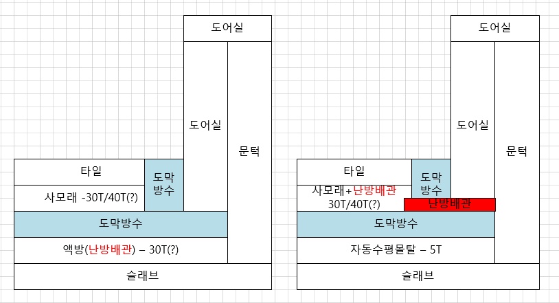 슬래브 ->액방1차->도막방수->사모래(난방배관)->타일