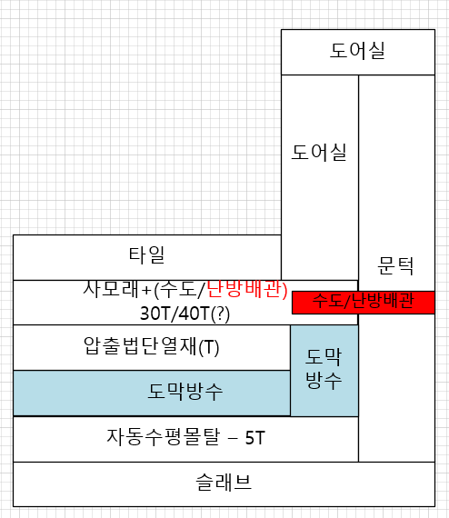 슬라브 - 몰탈미장(슬라브면이 평활하지 않을 경우) - 도막방수 (이중배수) - 압출법단열재 - 사모래(난방배관) 타일