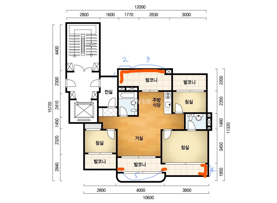1.) 도면에 표시한부분이 이전 곰팡이가 심하게 발생했던부위이며 비확장예정입니다.