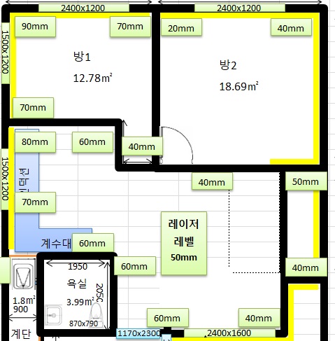거실 가운데서 50mm높이로 레이저 레벨을 쐈을때 네모안에 있는 숫자는 각 위치마다 레이저가 위치한 높이입니다