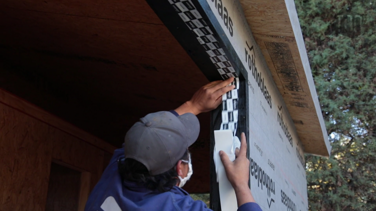 개구부 안쪽으로 접어 들어와서 목재와 1차적인 테잎 작업이 되고, 그 위에 창틀이 올라간 후에, 창틀과 투습방수지를 다시 한번 방수테잎으로 붙이는 방식입니다.