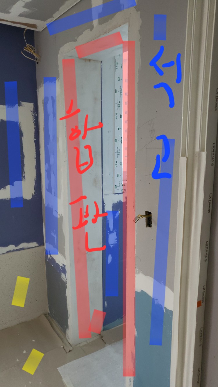 사진상 문틀?합판 이라는 부분과 그 왼쪽파란줄 부분 까지 타일을 하면 이상 할 것 같은데 저부분도 리브라스망?을 사용해 시멘트로 처리하고 도막방수 후 탄성코트 올리는게 좋을까요?
