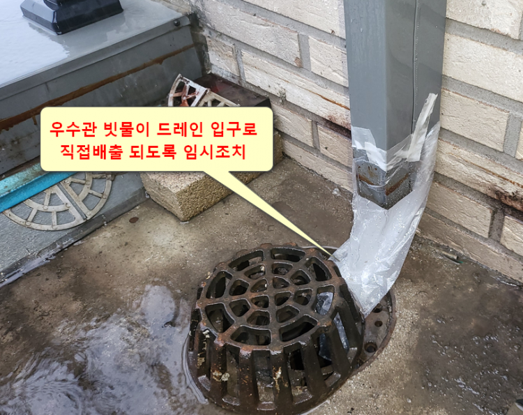2) 지붕 오수관이 베란다 조적벽에 붙여서 설치