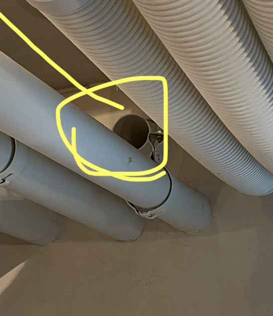 이 사진은 벽 외부 기계실쪽 사진입니다. 외부로 나가는 쪽으로 pvc관이 후렉시블 주름관으로 연결된 모습입니다.