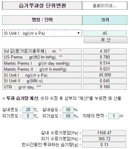 그러므로, (ng/m2ㆍsㆍPa) 의 값을 넣고, "계산"을 누르시면 해당 두께 25mm 의 Sd값이 아래에 나오도록 만들어 놓았습니다.
