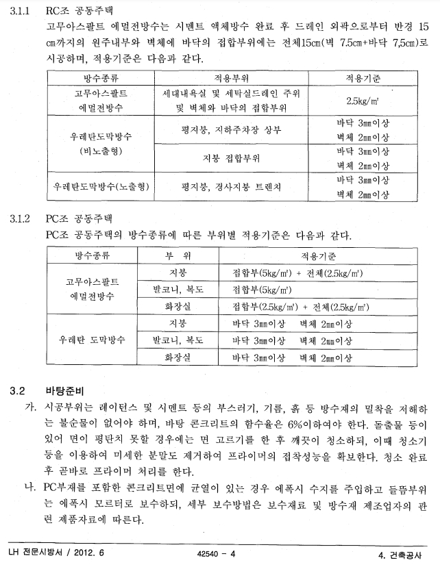 아래 LH공사 시방서를 첨부하겠으니 참고하시기 바랍니다.