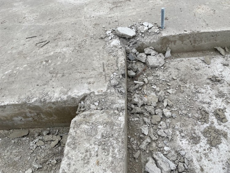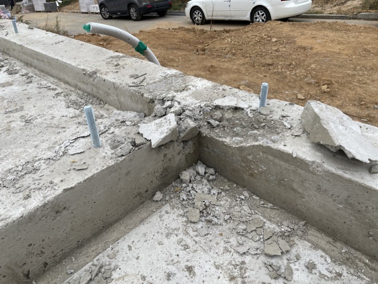 기초 타설후 모습인데요,, 다운틀 주변과 각종 모서리 부분들이 사진과 같이 많이 깨져있습니다