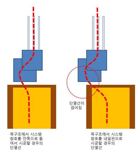 네일핀을 이용하면.. 창호가 외부로 돌출됩니다., 즉 단열선이 외부로 빠져 나오게 되면서 부분적 열교 현상이 생깁니다.