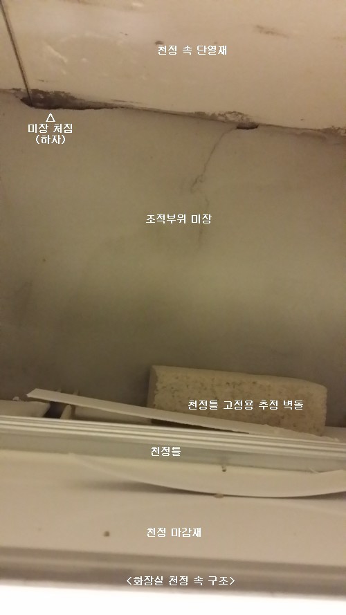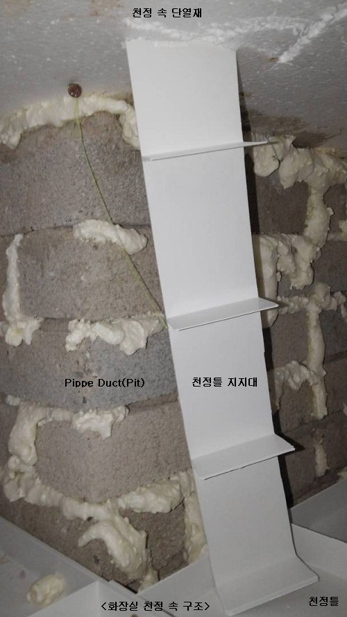 이를 구획하고 있는 벽돌벽의 수직줄눈이 밀실하게 채워지지 않은 상태에서 떠붙이기 타일공법이 적용되었다는 것이 하나의 문제로 더 작용하고 있으며, 거기에 또 하나의 문제점이 도사리고 있는 것이 화장실 속 천정구조입니다.