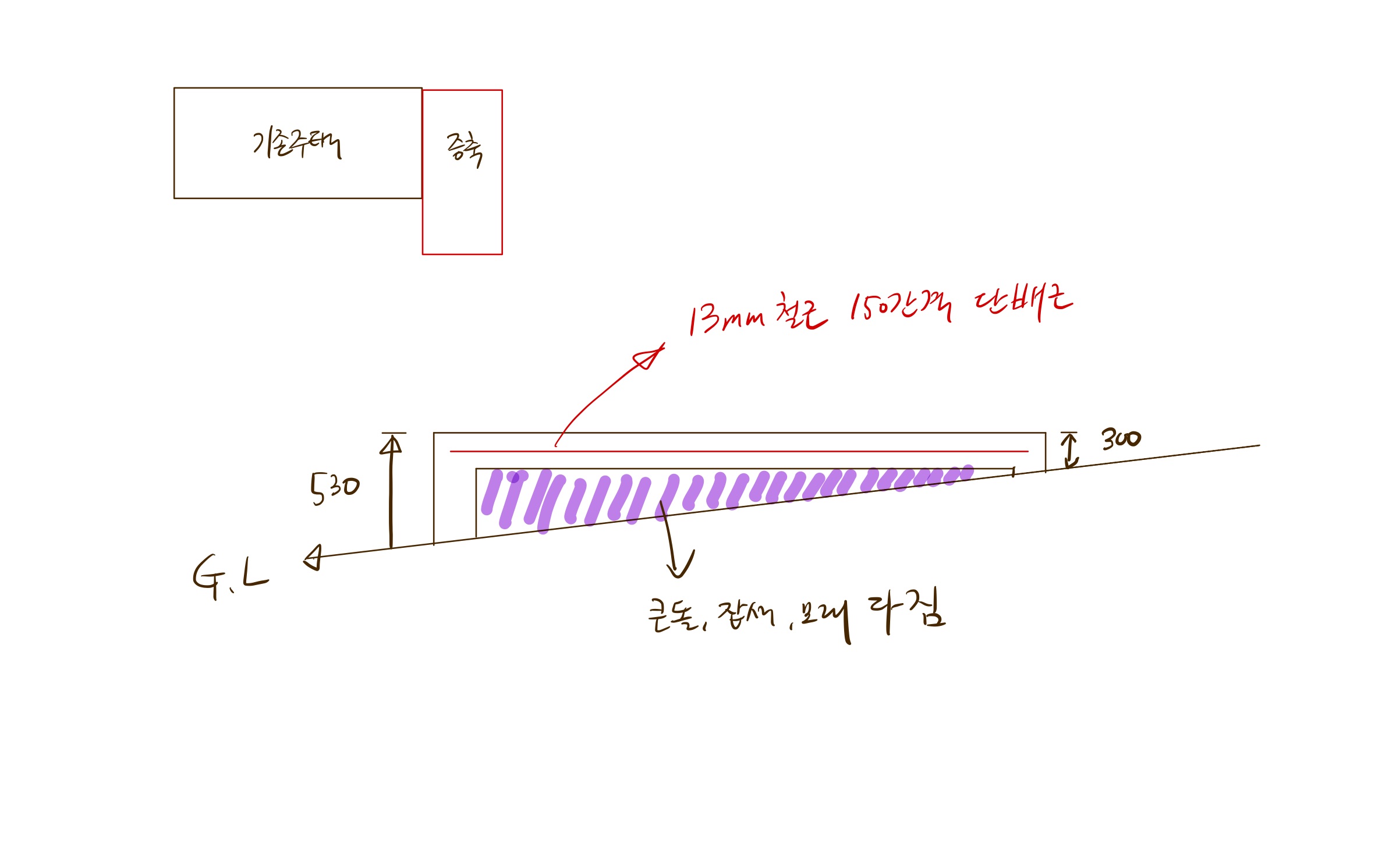 (질문1.) 그 경사에 맞추어 증축 기초를 터파기 없이 콘크리트 평기초 단배근(13MM 이형철근 150mm 간격)으로 하면 구조적인 문제가 있을까요? 그렇게 기초를 만들면 집 앞쪽 기초 높이는 530이 되며 집 뒷편 기초는 300이 됩니다.