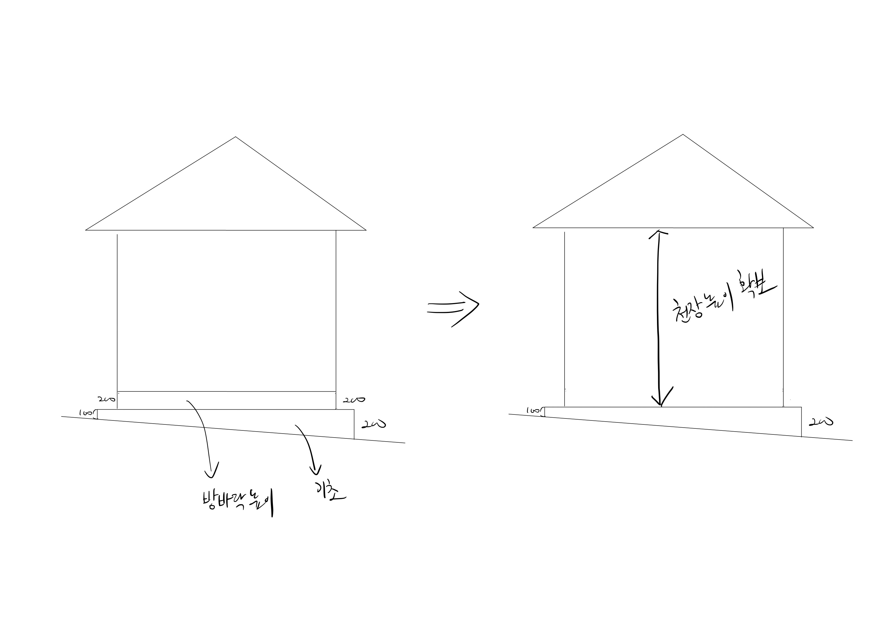 만약 기초높이 정도로 방바닥 높이를 낮추고 집 뒷편에는 유공관을 설치하여 배수를 원할히 한다면 어떨까요? 그래도 구조적으로 안전한 방법은 아니겠지요?