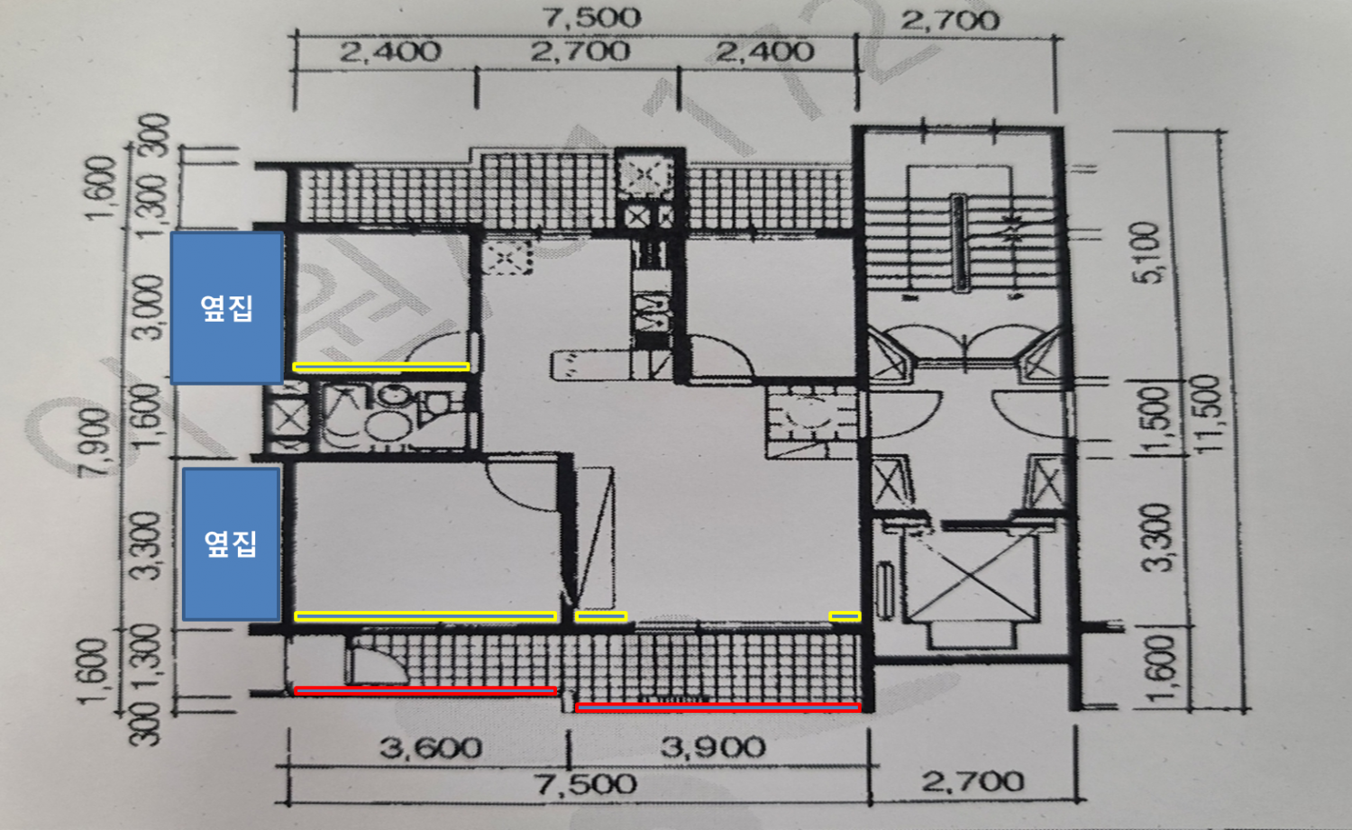 아랫집 윗집이 베란다 확장을 하지 않았다면 노락색 부위에 단열공사를 해야 결로를 방지할 수 있습니다. 만약 아파트의 층수가 저층이라면 엘레베이터와 현관부위에도 곰팡이가 발생할 수 있습니다.