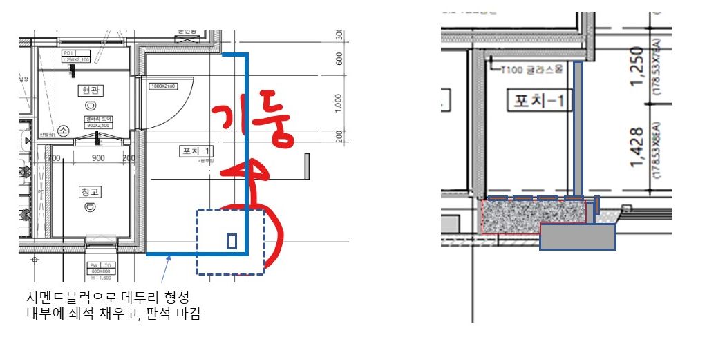 안녕하세요. 올려주신 요약 도면을 보니 포치의 기둥을 건식 마감 후 판석 위에 고정하라는 의미 같습니다. 이럴 때 기초 콘크리트 슬라브에 고정하는 것보다 불안정하지 않은지요? (초록색 표시 부분)