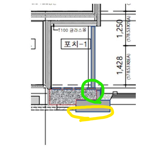 구조 검토도 끝냈구요. 다만, 포치1에 기둥이 하나 있는데, 해당 기둥이 분리 타설된 포치-1의 기초 콘크리트 슬라브의 한 곳에 힘을 주어 지지하기에 기초 슬라브 갈라짐이나 깨짐이 발생할 것으로 보입니다.