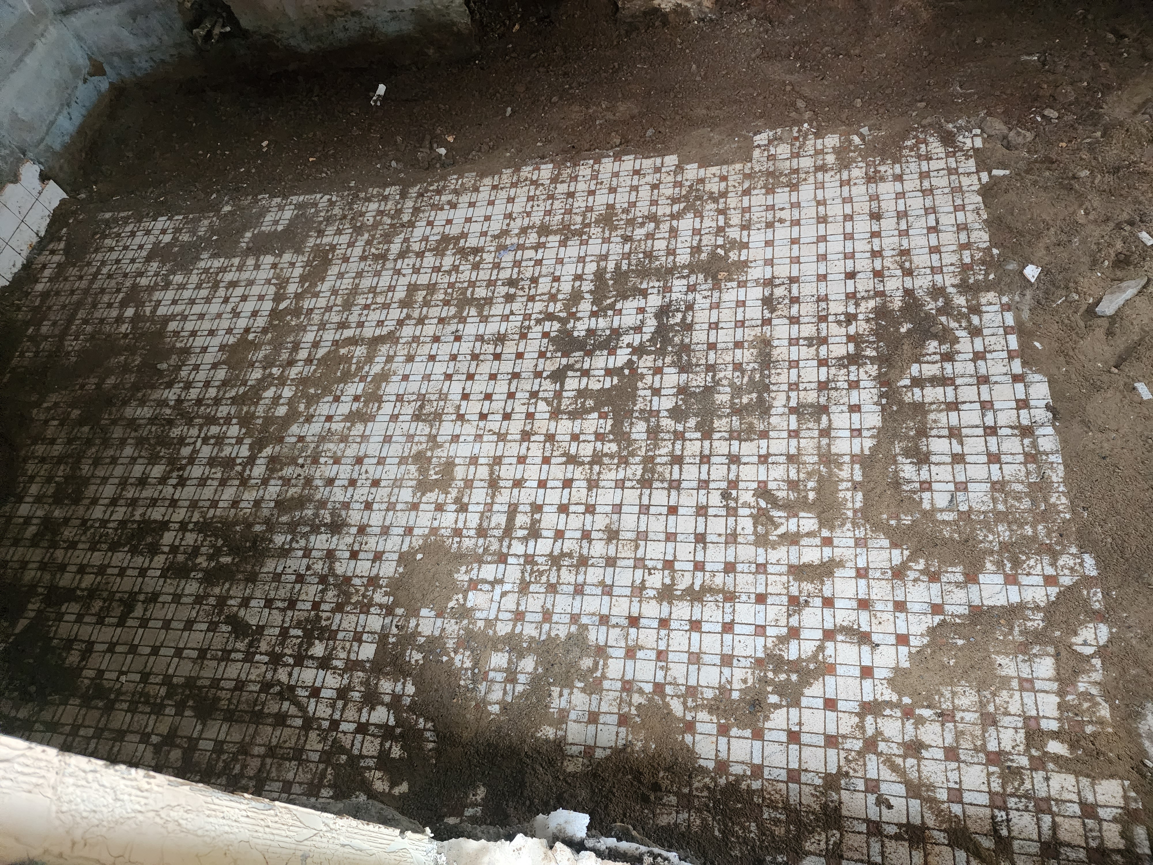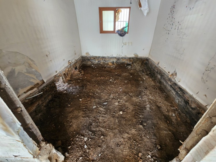 모든바닥이 흙이면 오히려 좋았을것 같은데요 , 60년대 아궁이 있는 주방으로 예상되는 타일 마감된면.  그리고 불법증축을 하였던 곳의 기존 외부 마당으로 예상되는 시멘트몰탈마감층도 있어요.