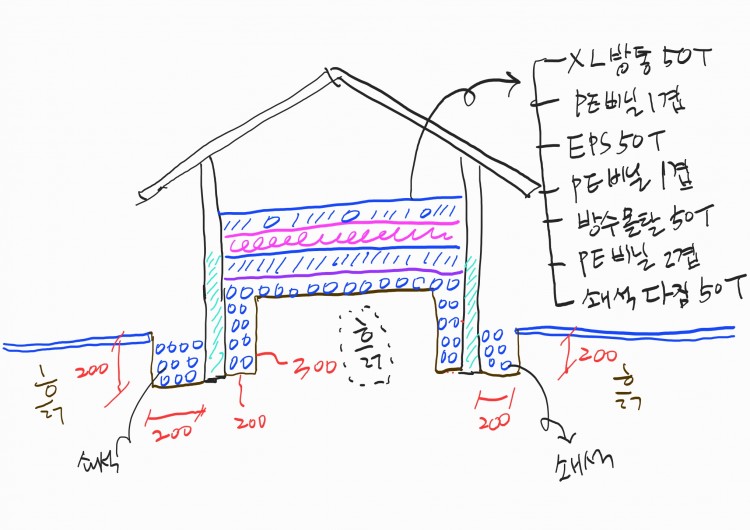 방수몰탈 50T 가 제외되었으므로 , 습기를 막기위한 바닥 쇄석다짐층을 조금 높일까 하는데,