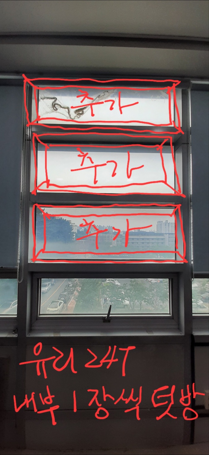 실내측으로 추가 설치를 하여 (물론 실내측이 개방된부분만 설치가 가능하고 커튼월 안쪽이 막혀있는 부분은 추가설치가 불가능합니다.) 여름철 유입되는 일사에너지를 조금이라도 더 차단해보려고 계획을 세웠습니다.