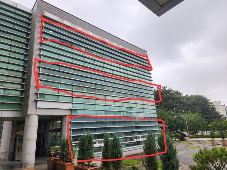 기존에 설치되어 있는 외벽 커튼월의 유리는 22미리 일반 그린투명 복층유리입니다.