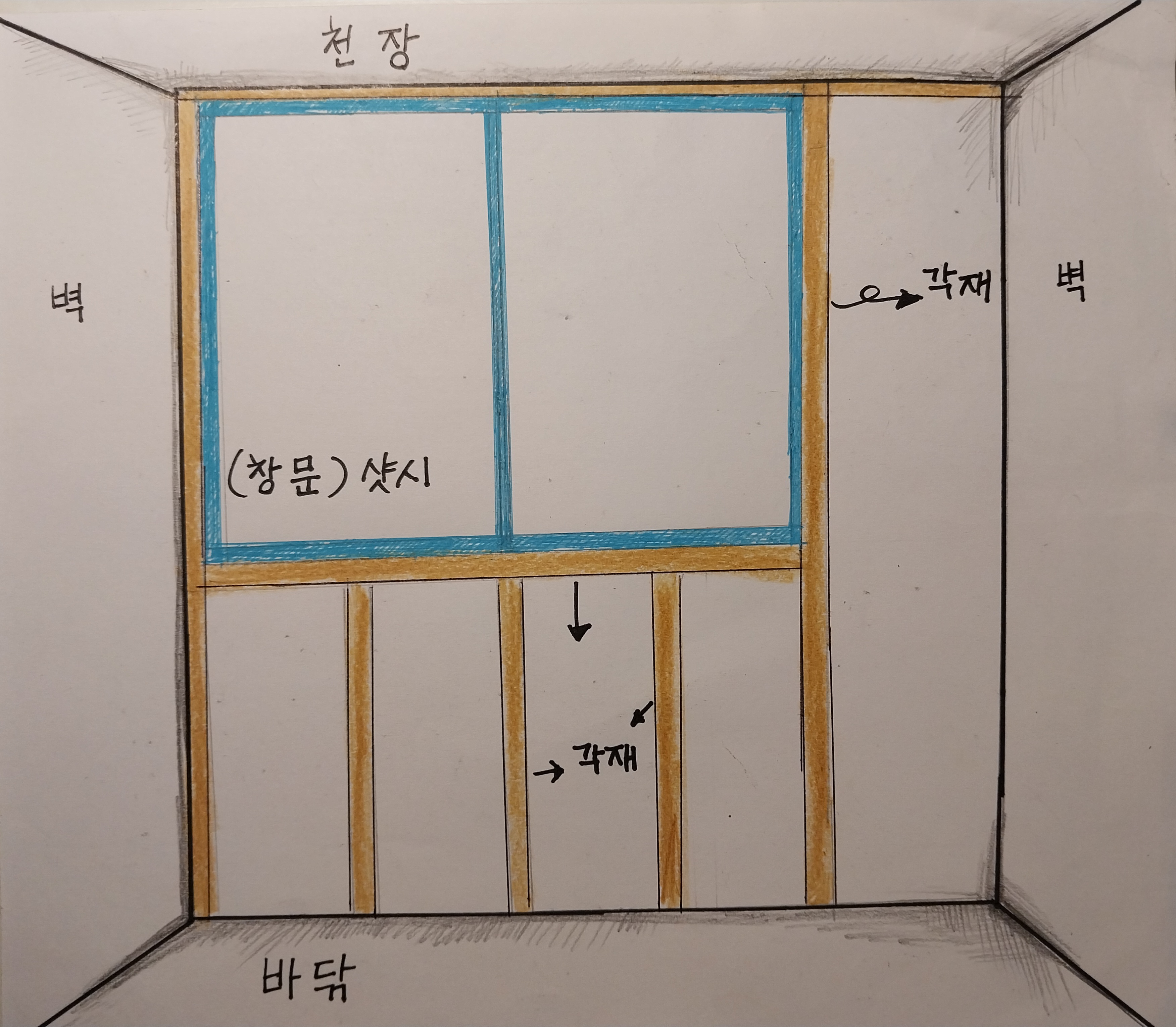 바닦 실리콘으로 고정시키고, 창틀(샷시)밑에 'ㅁ' 자로 틀을 짠다음 마치 선반위에 샷시를 얹어놓은거처럼 해놓으면 어떨까 싶어서요. 기존의 각재는 최대한 살려놓으면서요.  의견 부탁드리며, 감사합니다!!
