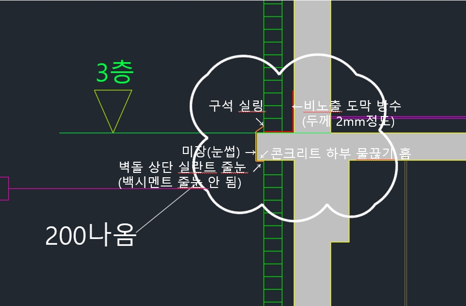 치장벽돌 배면을 통해 누수되는 경우가 있기 때문에 슬래브와 벽 구석은 도막방수를 하고, 전면 미장(눈썹 미장이라고도 함) 시 상부는 물이 흘러내리기 좋을 정도 경사지게 하며, 벽돌 상부와 슬래브 하부가 접하는 부위는 백시멘트가 아닌 실링재로 줄눈을 해야 하는데 그 이유는 치장벽돌 벽이 비내력벽이기 슬래브 하부와 접한는 상부 줄눈이 파괴되기 때문입니다. 그리고 슬래브 내민 부분 하부에는 물끊기 홈을 골조공사 시 만드는 게 원안입니다.