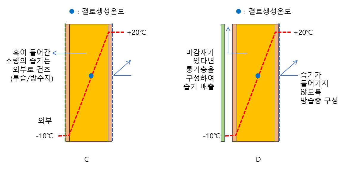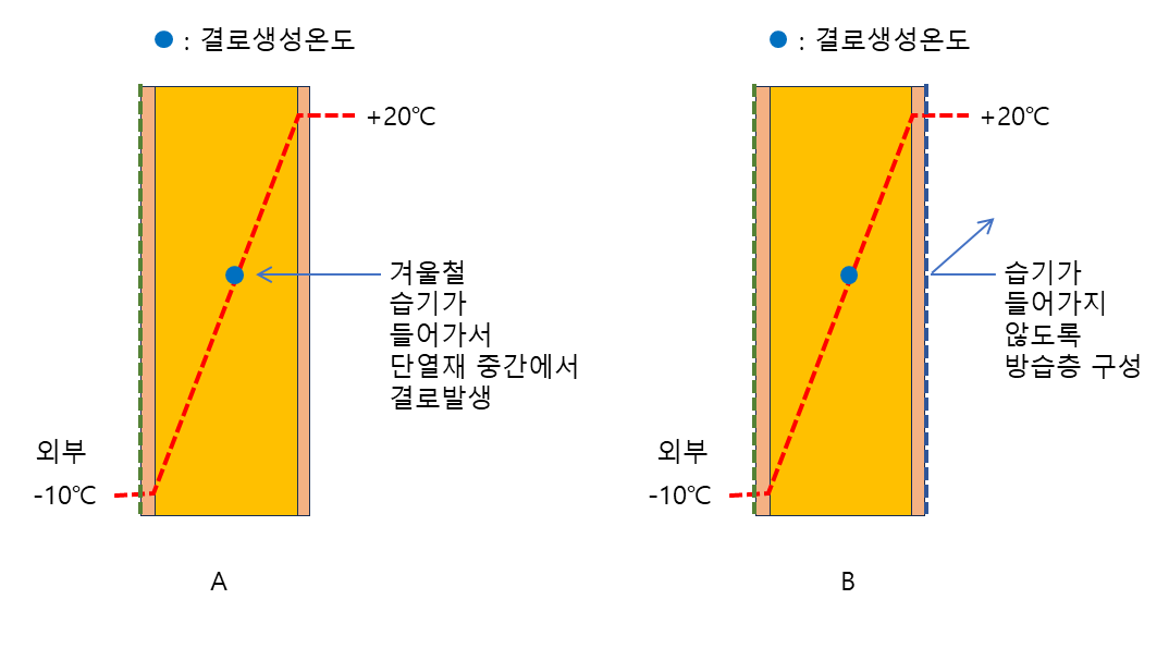외측으로의 습기배출을 기대할 수 없는 조건이므로, 방습을 목표로 외단열을 구성