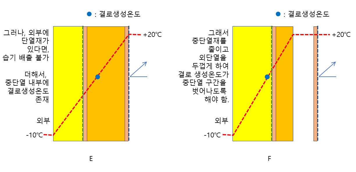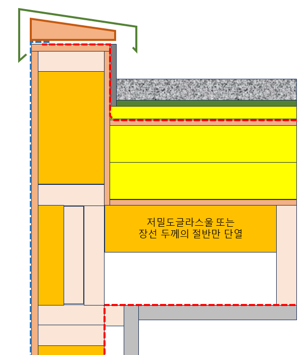 그러므로 배출이 안되는 것을 전제로 구조체 내부에 피해가 없어야 하기에, 목구조의 장선 사이에 설치하는 중단열을 생략하던가 절반으로 줄어야 한다는 의미의 그림입니다. 그래야 구조체 내부에서의 결로 현상을 피할 수 있기 때문입니다.
