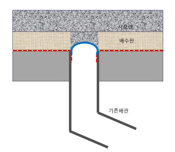 지금 PVC 배관을 구조체 표면 높이에서 잘라내고, 그 위에 바로 트랜치를 올리면 되세요. 즉 이중배수 개념이 아니고, 바로 빠지는 구조입니다.