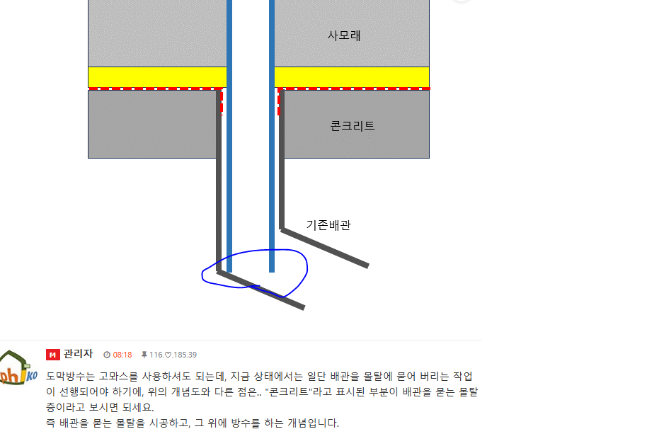 도막방수는 고뫄스를 사용하셔도 되는데, 지금 상태에서는 일단 배관을 몰탈에 묻어 버리는 작업이 선행되어야 하기에, 위의 개념도와 다른 점은.. "콘크리트"라고 표시된 부분이 배관을 묻는 몰탈층이라고 보시면 되세요.