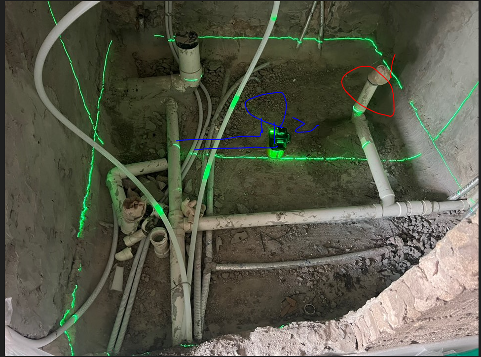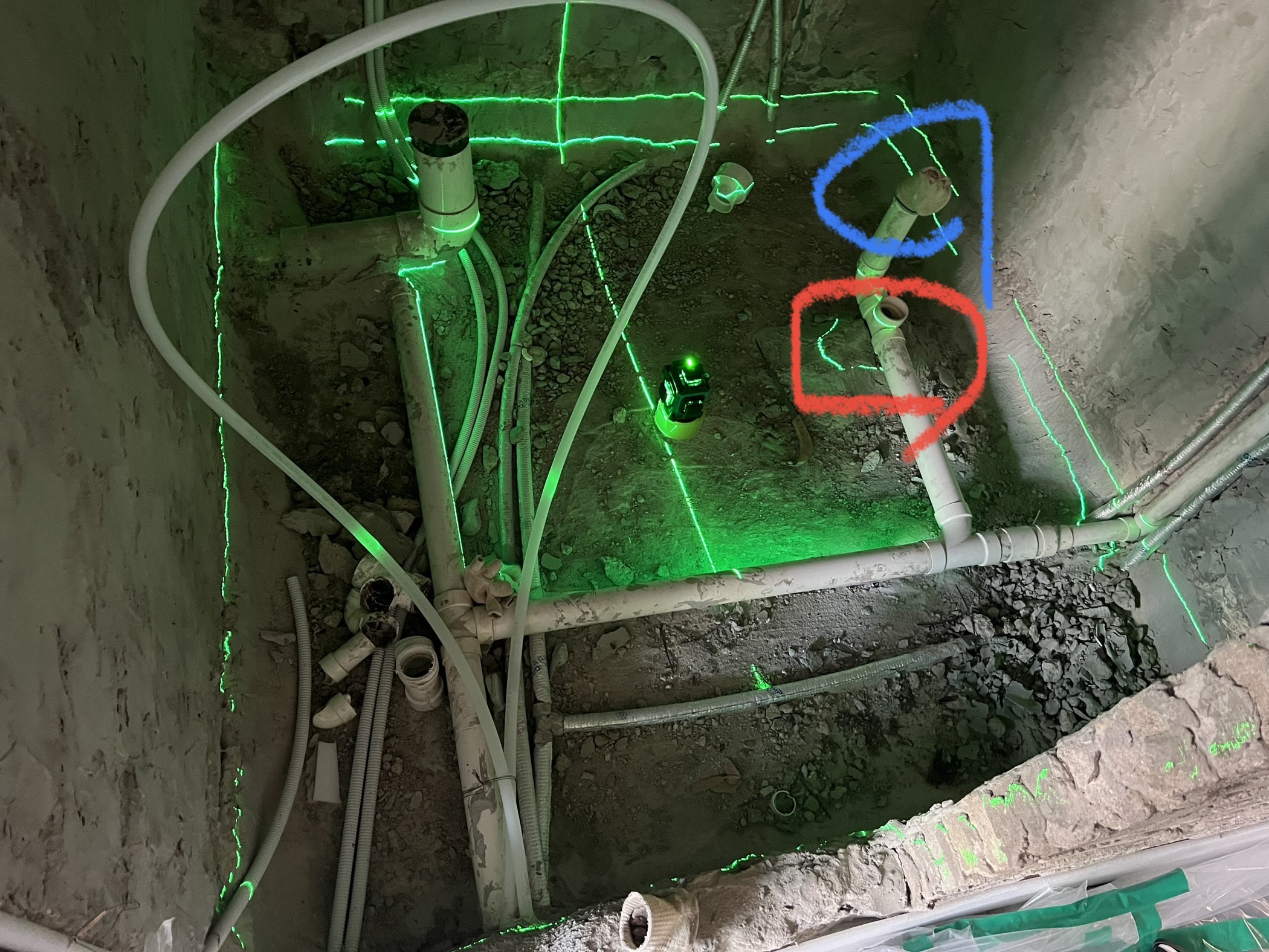 상수관은 배관의 두께가 두껍지 않아 방통 속에 다 묻힐 것 같은데, 하수관과 오수관은 두께가 두껍고, 구배가 잡혀있다보니 모든 하수관과 오수관의 상부가 완전히 방통 속으로 묻히지 않습니다.