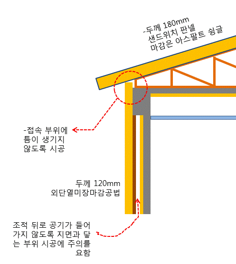 상기 방법은 샌드위치판넬을 활용한 경사지붕이기 때문에.. 지금처럼 실내측에 별도의 단열조치와 지붕 방수조치를 하지 않아도 되는 장점이 있습니다.