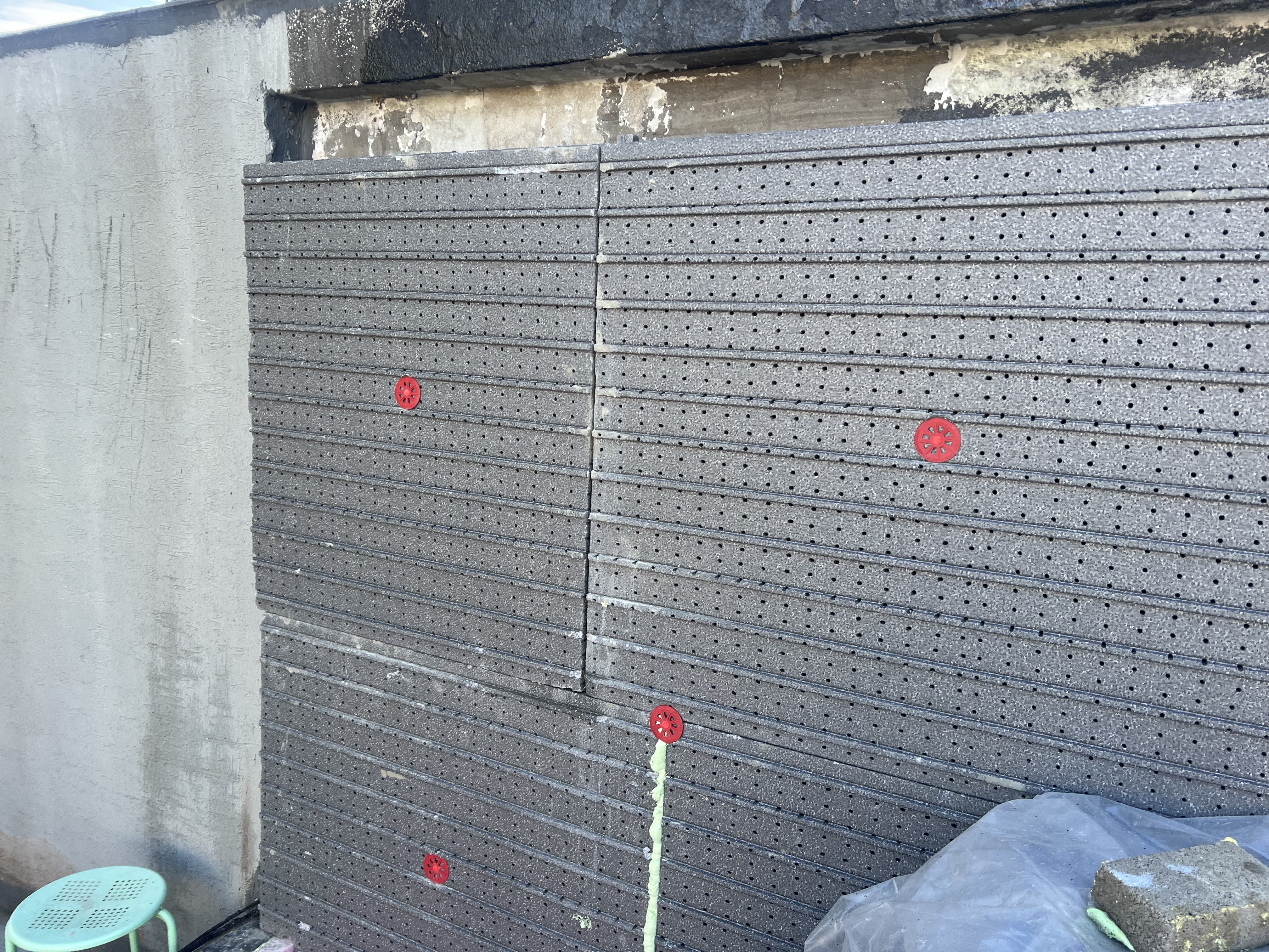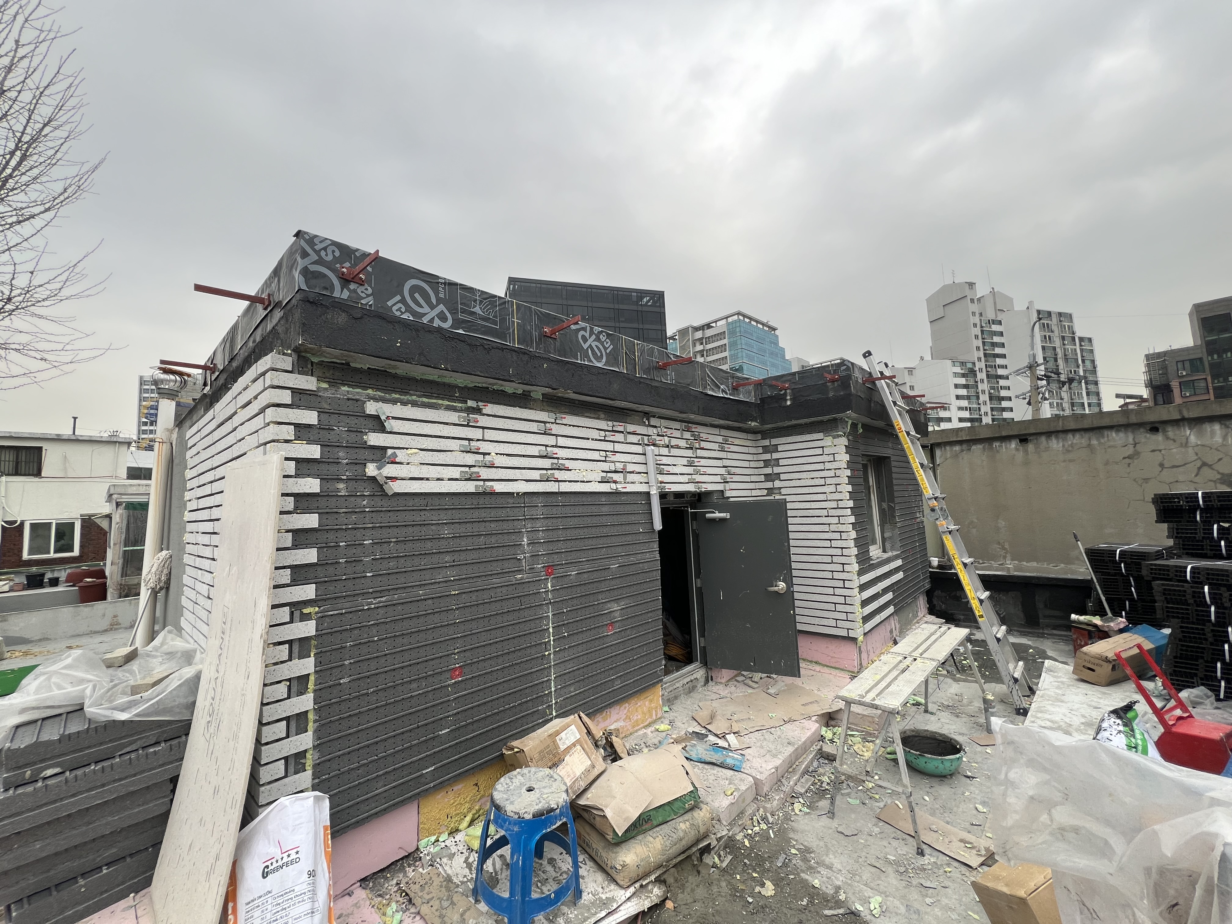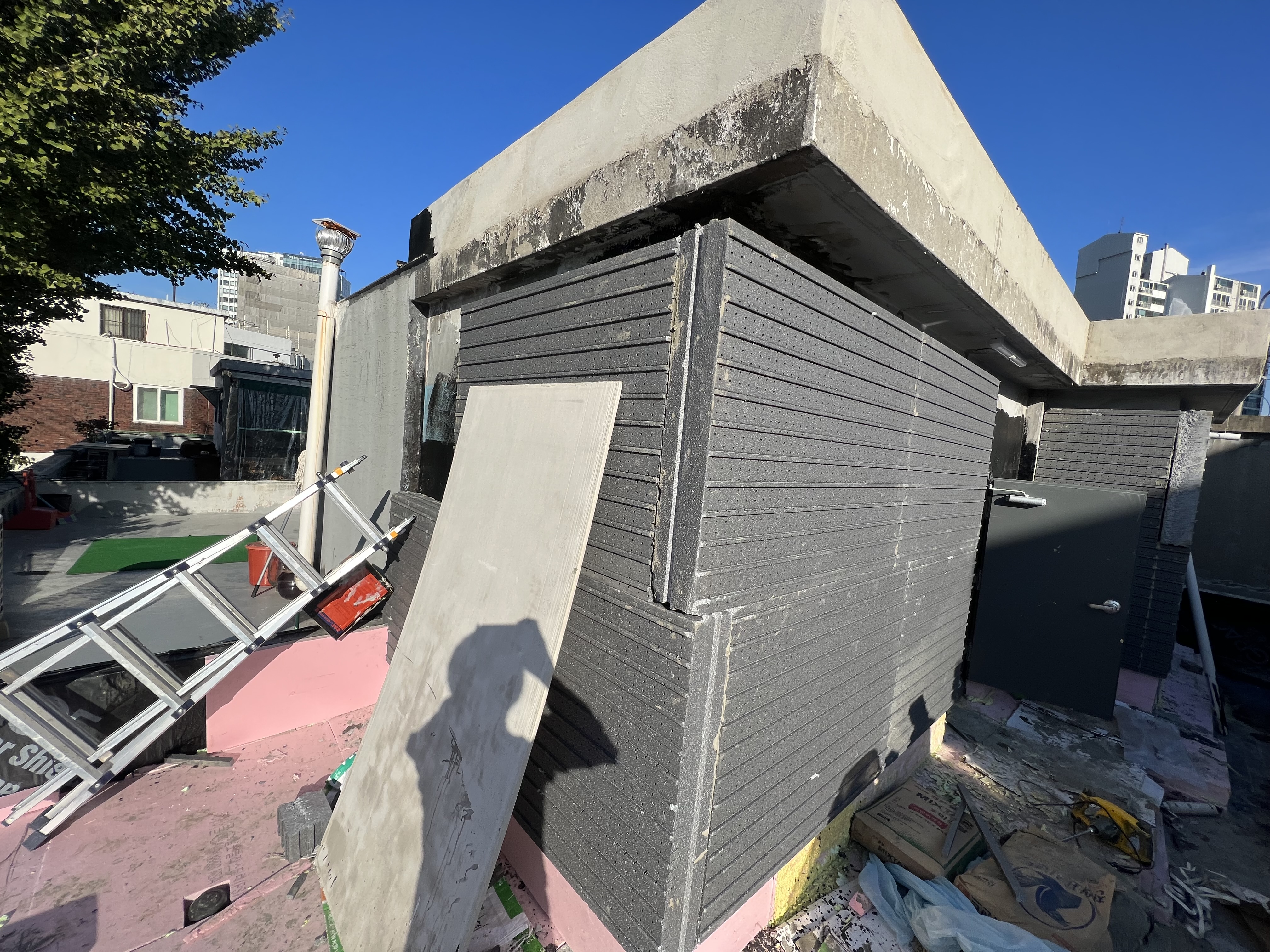2층 건물의 옥상에 있는 옥탑에 외단열을 한 것입니다. 층수로 따지면 1층 위치에 단열재를 부착한 것이고. 스치로본드는 아끼지 않고 단열재 후면에 100%에 가깝게 바른 후 부착하였습니다.
