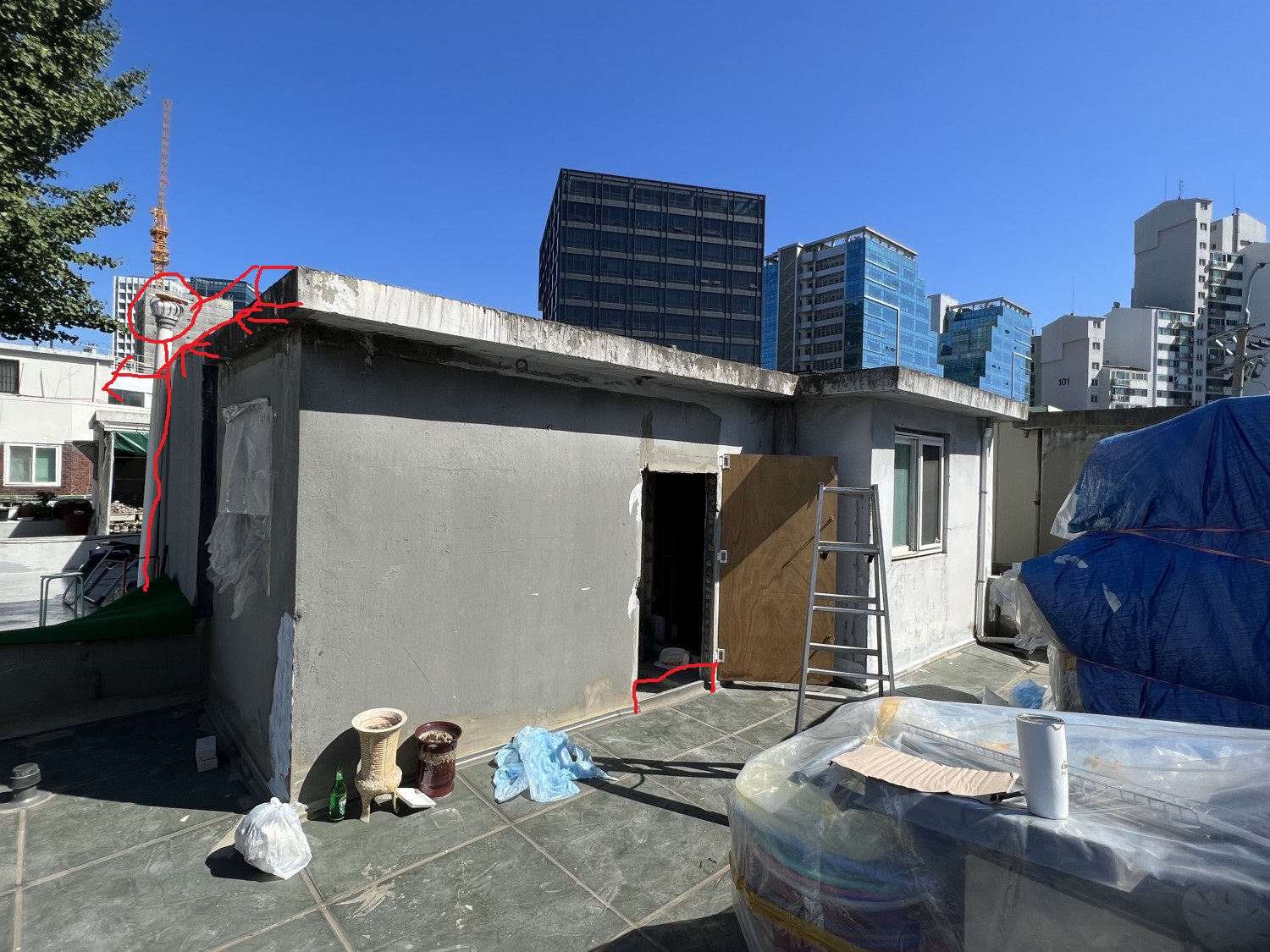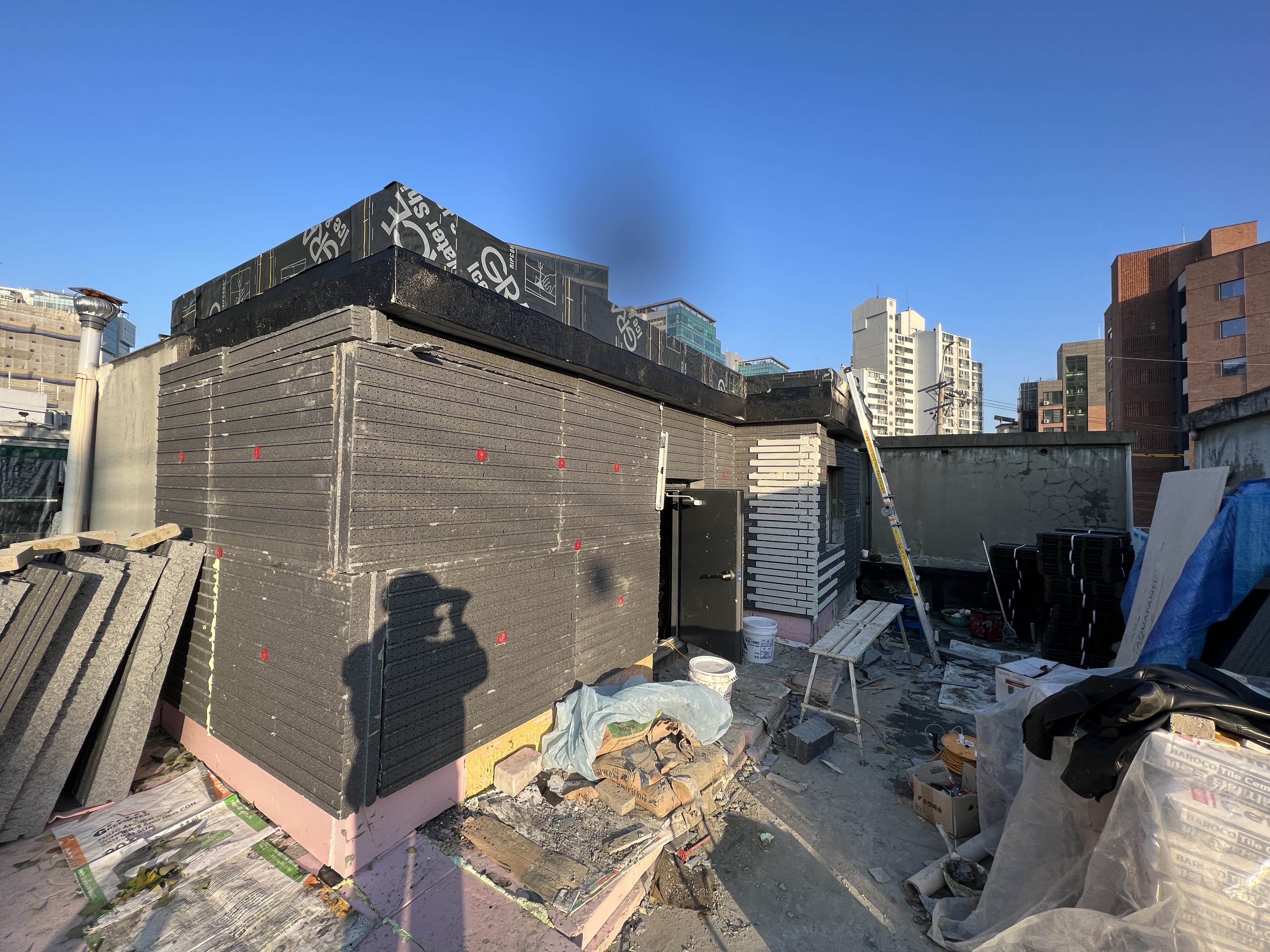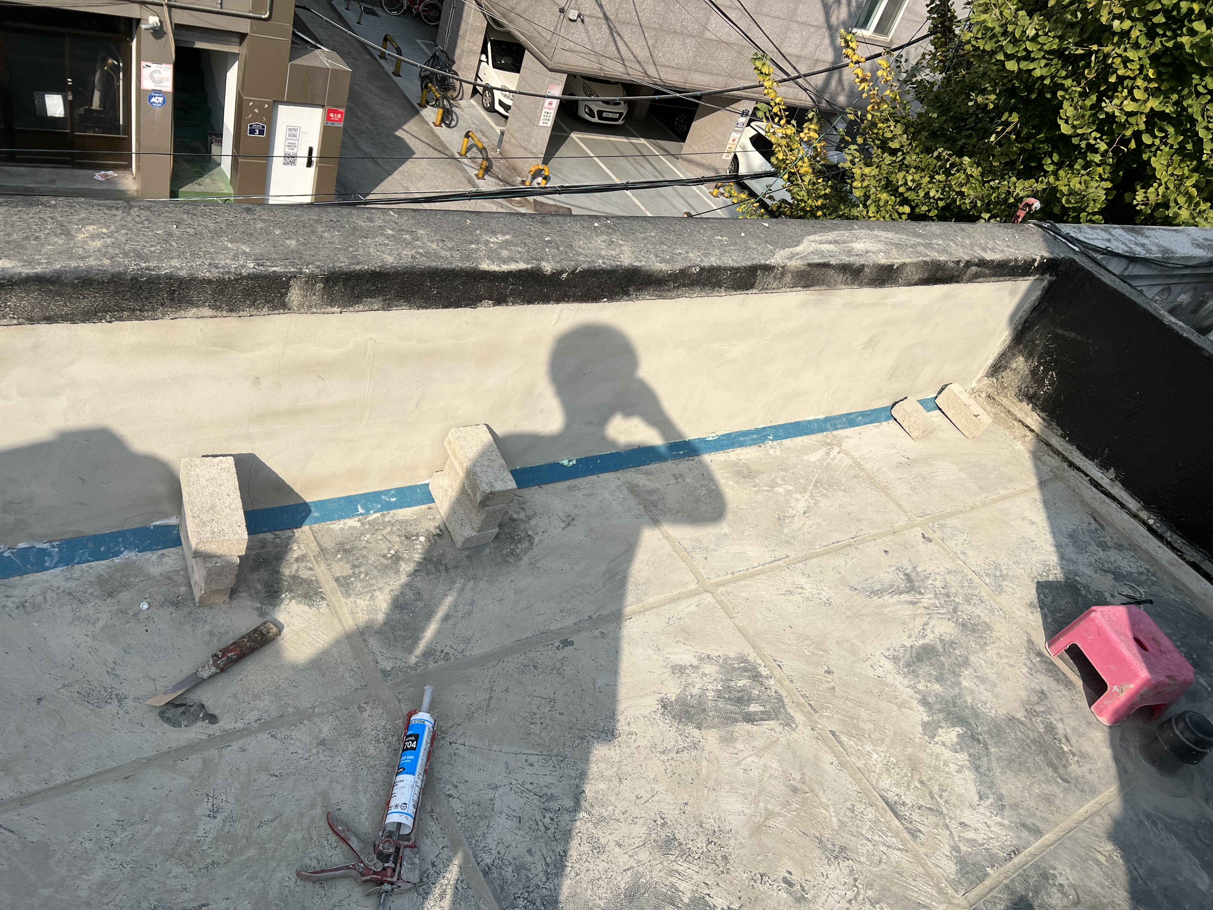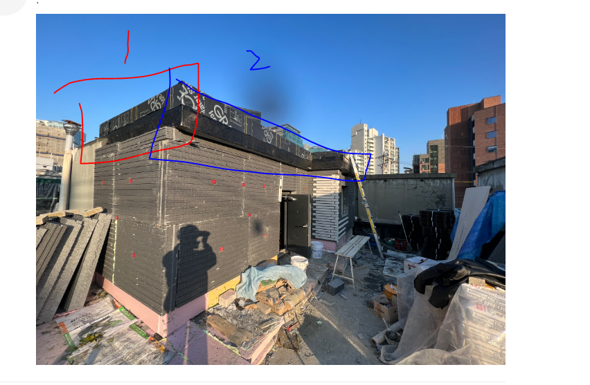 그래서.. 이 부분도 미장을 하루 더 불러서 파라펫 안쪽 부분에 조적 및 미장을 해서 출입구 문턱처럼 단을 만들어주려고 합니다.