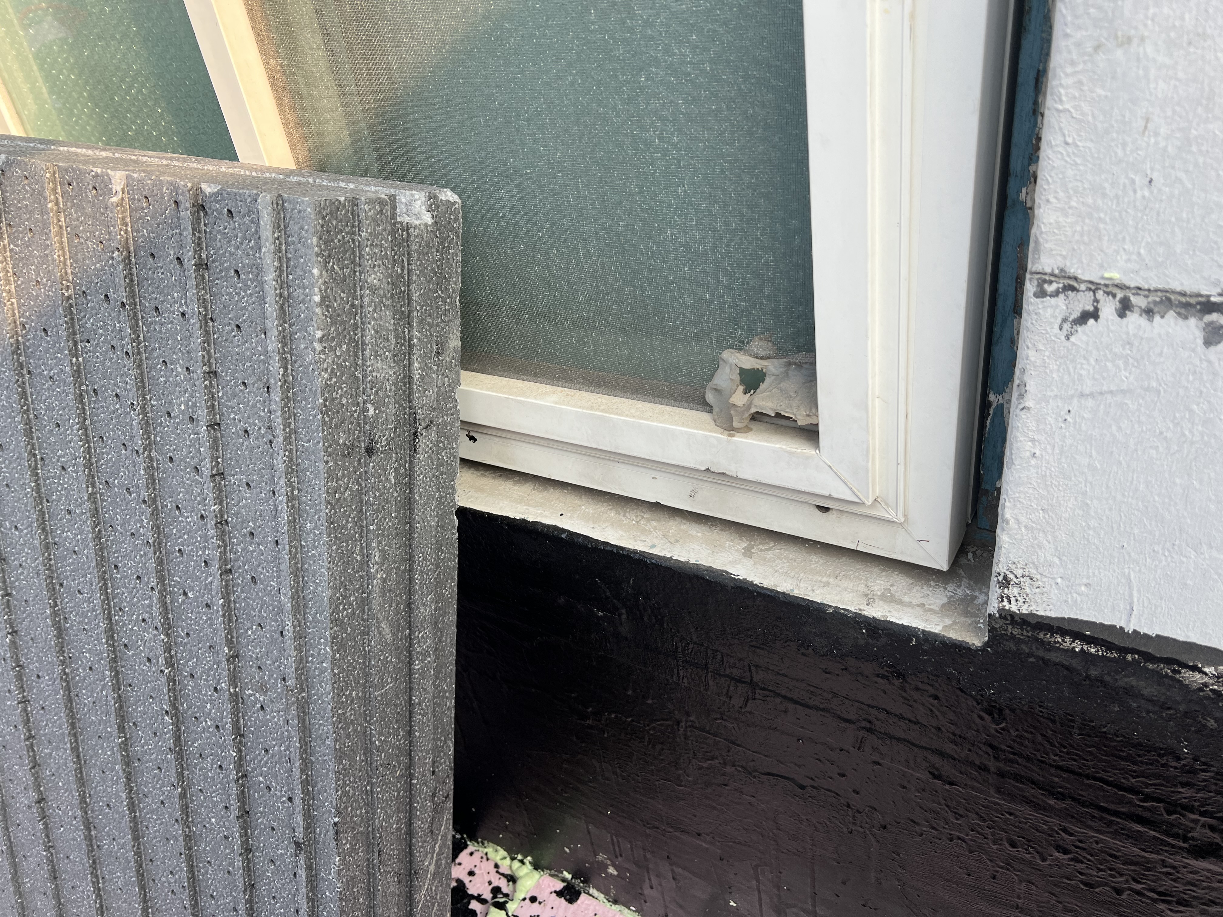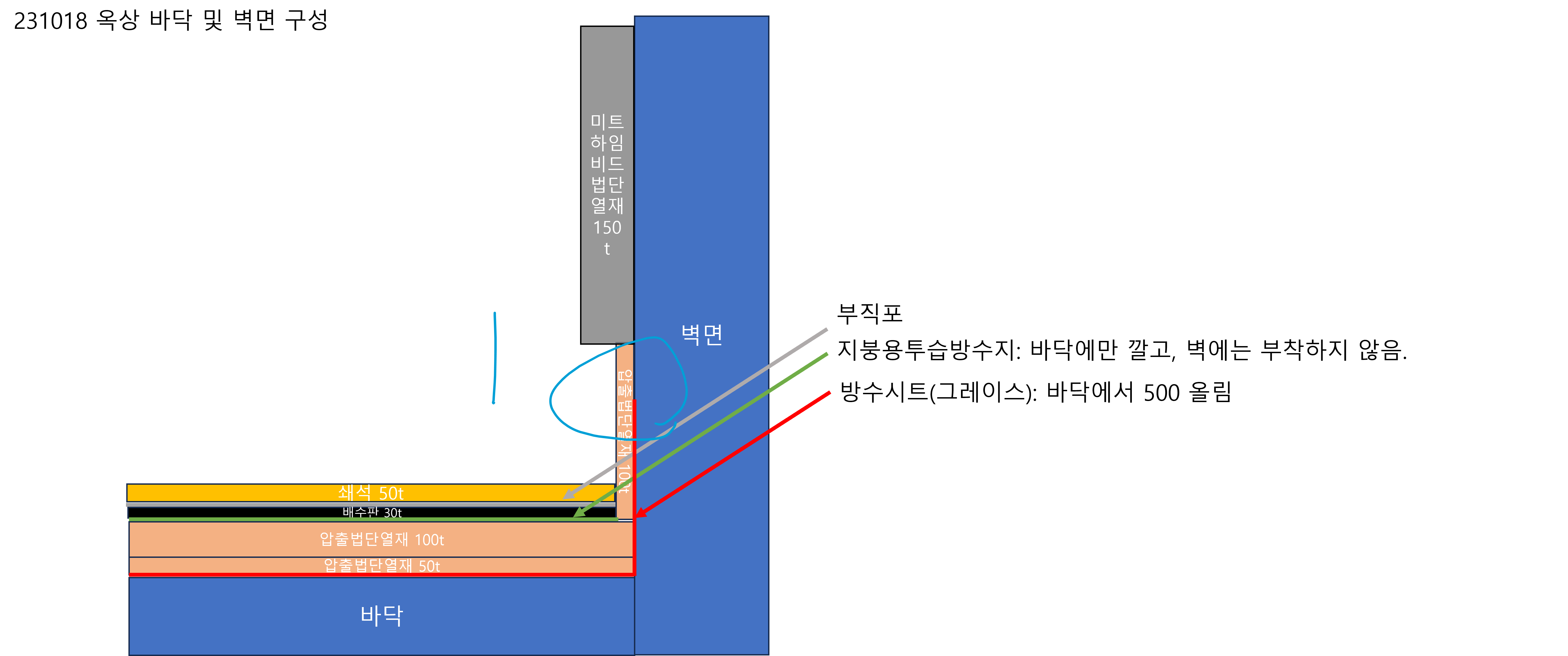기존에 스틸방수라고 해서 방수를 한번 했는데 벽면 타고 비가 조금씩 새고 잇어서 방수시트로 벽체(바닥에서 500mm 정도)까지 올린 다음 외단열을 하면 벽타고 내려오는 비는 없을 거라 생각했습니다.