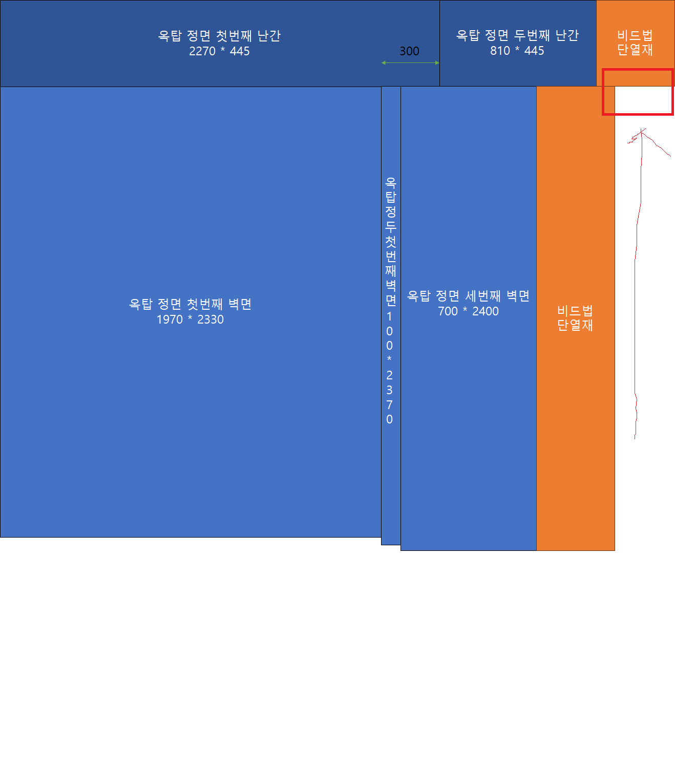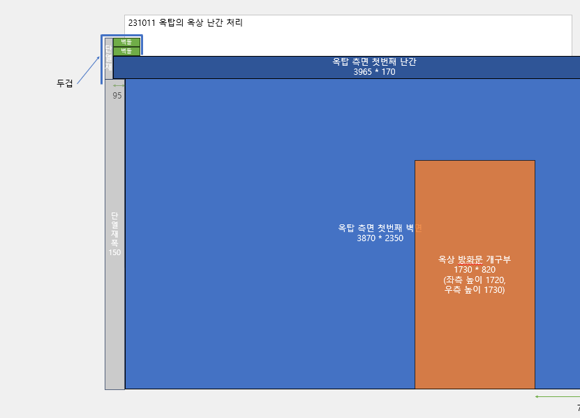 옥탑은 벽면마다 두께가 다른데 250인 곳도 있고 130인 곳도 있습니다