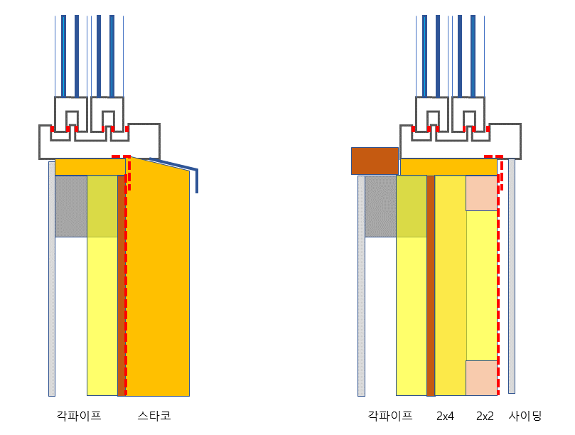 1. 외부의 단열재 위에 창문을 올릴 수는 없습니다. 다만, 오른쪽 처럼, 사이딩 마감을 위한 바탕재가 들어갈 경우, 그 바탕재 위에 창문을 올릴 수는 있습니다.