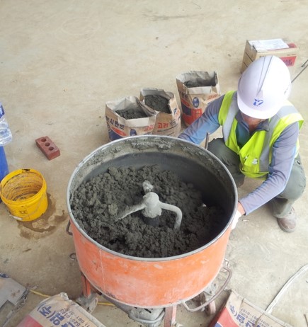 2010년 경 평택 미군부대 공사 시 치장벽돌 줄눈 모르타르 기계 믹싱하는 장면인데, 건조 줄눈 시멘트 1포당 물 배합비를 표준화시켜 시공했습니다. 종합하면, 시멘트 모르타르에는 적정한 량의 물이 필요하고 반드시 비빔(된비빔 또는 반죽 상태)하여 사용해야 합니다.