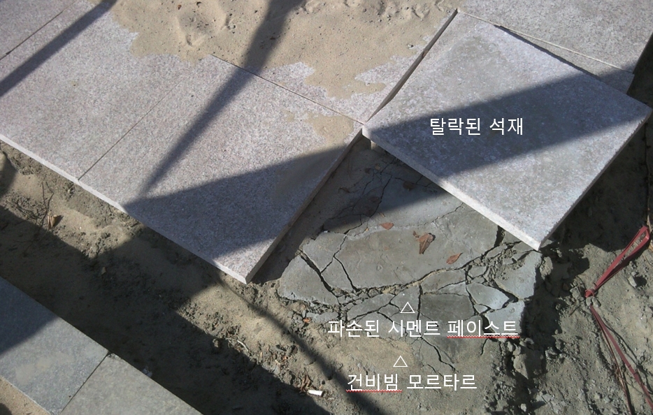 일례로 현장에서 바닥 석재를 까는 공사를 할 때 시공자는 꼭 모래와 시멘트를 요구하는데, 이는 위에서 설명한 바와 같이 모래에 함유된 수분 즉, '표면건조 내부 포화 상태'인 물의 량(함수량)을 활용할 수 있기 때문입니다만, 이렇게 시공된 바닥 석재는 사람만 사뿐사뿐 다니는 경보행용으로는 가능하지만 차량 통행이나 중량물이 이동하는 경우에는 시멘트 페이스트를 뿌려 접착시킨 하부 모르타르는 강도 발현을 하지 못해 상부 하중에 따라 부서질 수밖에 없습니다. (사진 참조)